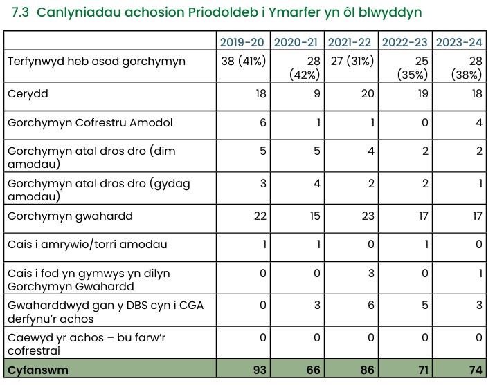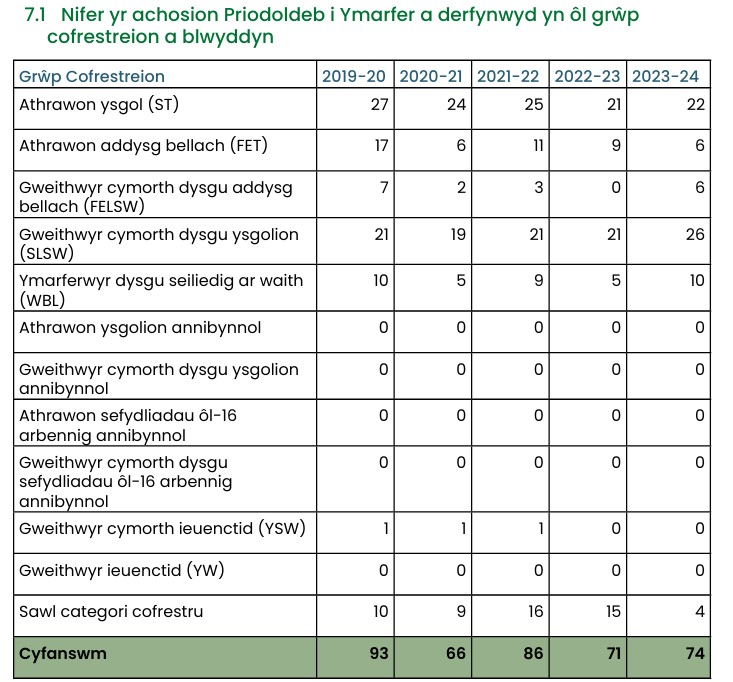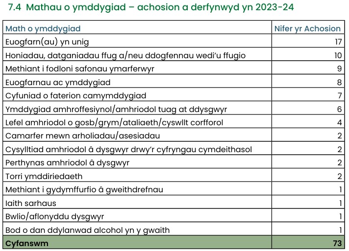 Dengys y data isod, er gwaethaf hyfforddiant diogelu cynhwysfawr a disgwyliadau ymddygiadol clir, fod y paneli Priodoldeb i Ymarfer yn parhau i ddelio â digwyddiadau o gamymddygiad yn rheolaidd.